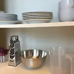 La cocina, completa con servicio de tetera/cafetera, un hervidor eléctrico, un horno y utensilios de cocina ofrece todas las comodidades necesarias para una estancia cómoda.
